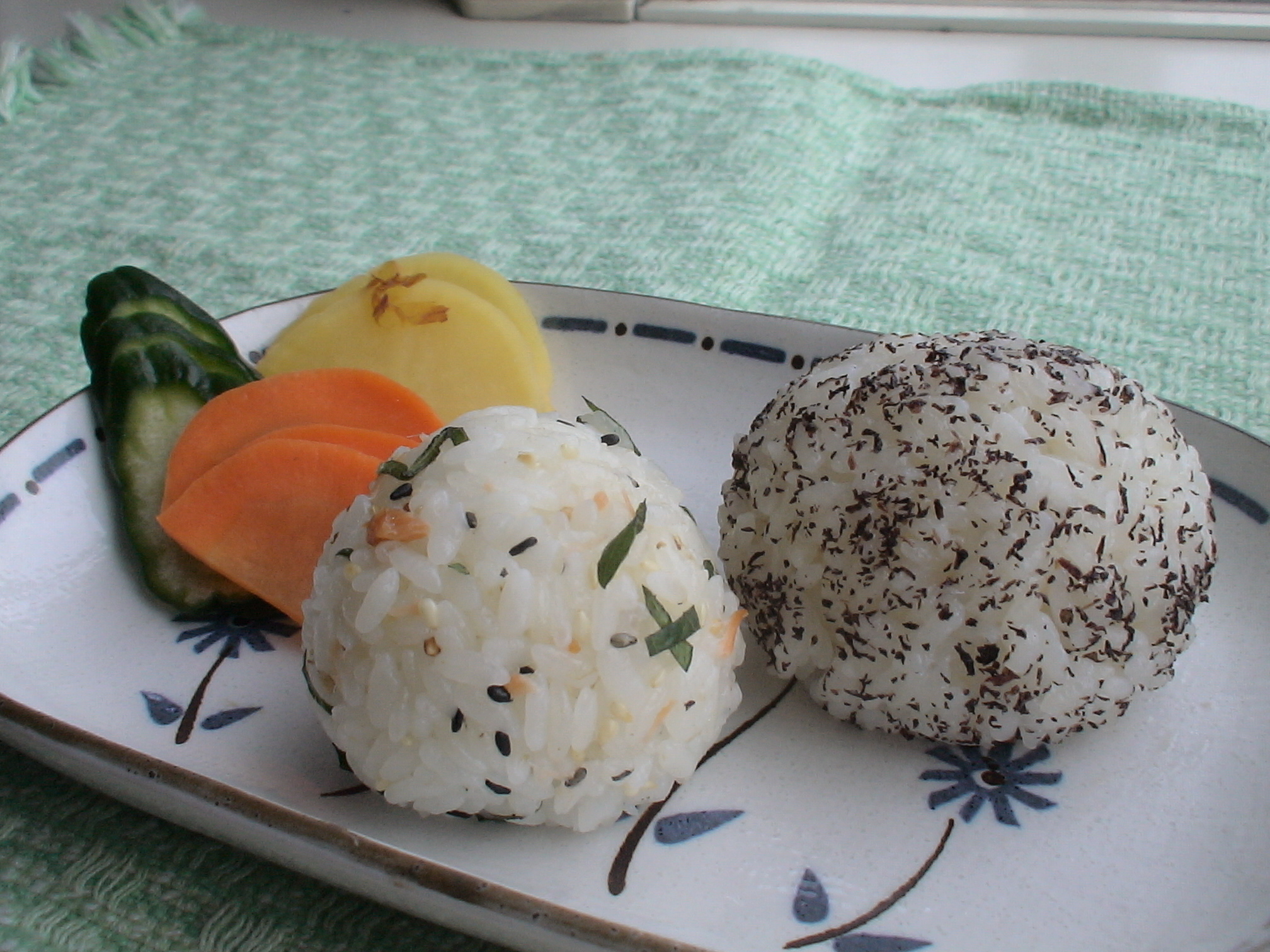 実は、右側の「ゆかり」のおにぎりは成功しましたが、左側「鮭・シソ・白ごま・ゴマ塩」は、鮭のほぐしが大きかったのか、ひとつにまとまりませんでした(T_T)