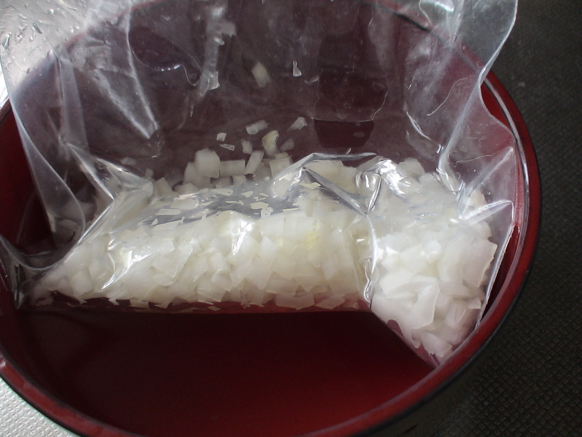 1.粗みじん切りにしたタマネギとニンニクを 生のまま冷凍保存用袋に入れしっかり空気を抜き、 冷凍する。(これが洋風野菜ミックス)