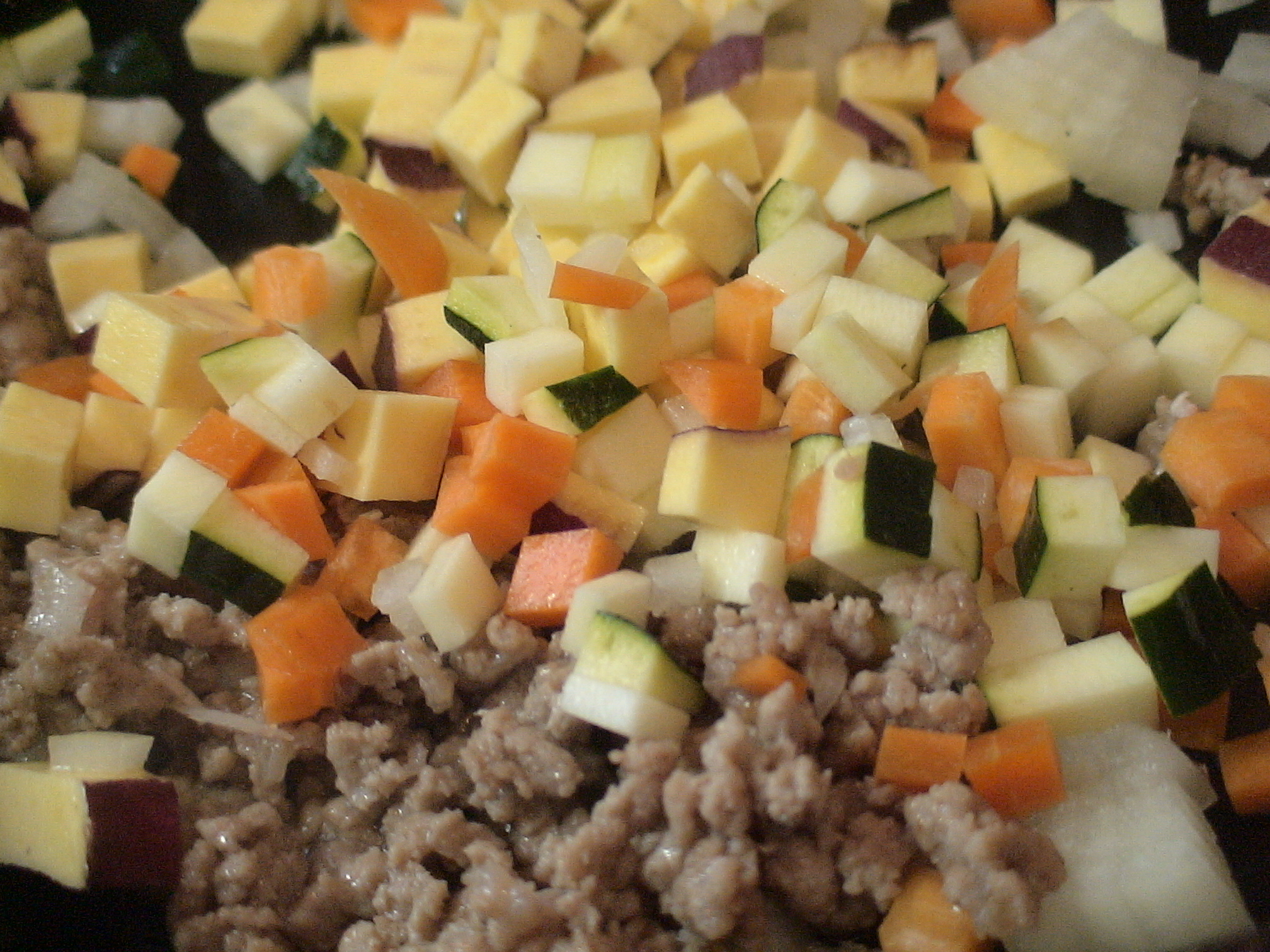 2.フライパンにサラダ油を熱し、豚ひき肉を炒め、色が変わってきたら1の野菜を炒める