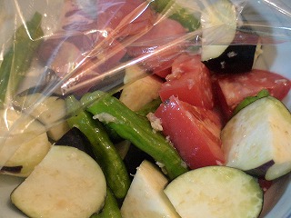 1.ナスは乱切り、タマネギは2cm角切り、トマトはざく切り、シシトウは数か所に穴を開けます。