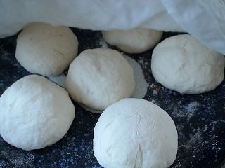 4.打ち粉(強力粉)を軽く振った台の上に生地を取り出し、6等分にしぬれ布巾をかけて、15〜20分休ませます。