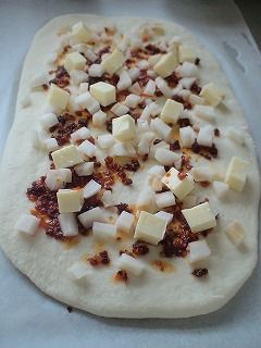 8.発酵後、ピザ用チーズをトッピングして(写真右)、ホームベーカリーのメニュー【14 焼き】25分を選択して焼きました。