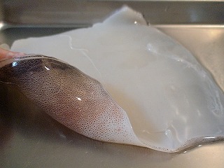 ※イカの皮を下にしてスプーン2杯の酢に3分間漬けることで、皮がむきやすくなります(写真右)