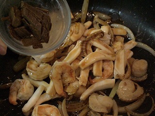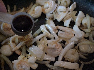 4.タマネギに少し色が付くぐらいまで炒めたら、エビ、イカ、ホタテ缶(汁ごと)を加えて、ホタテをほぐしながら炒めます。