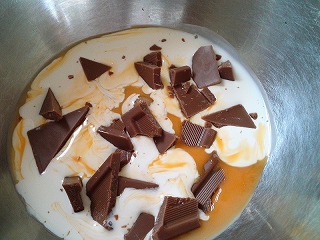 卵液と一緒にチョコレートを加えるところがポイント!ということですが、「?」溶けるというか、「固まっちゃった?!」