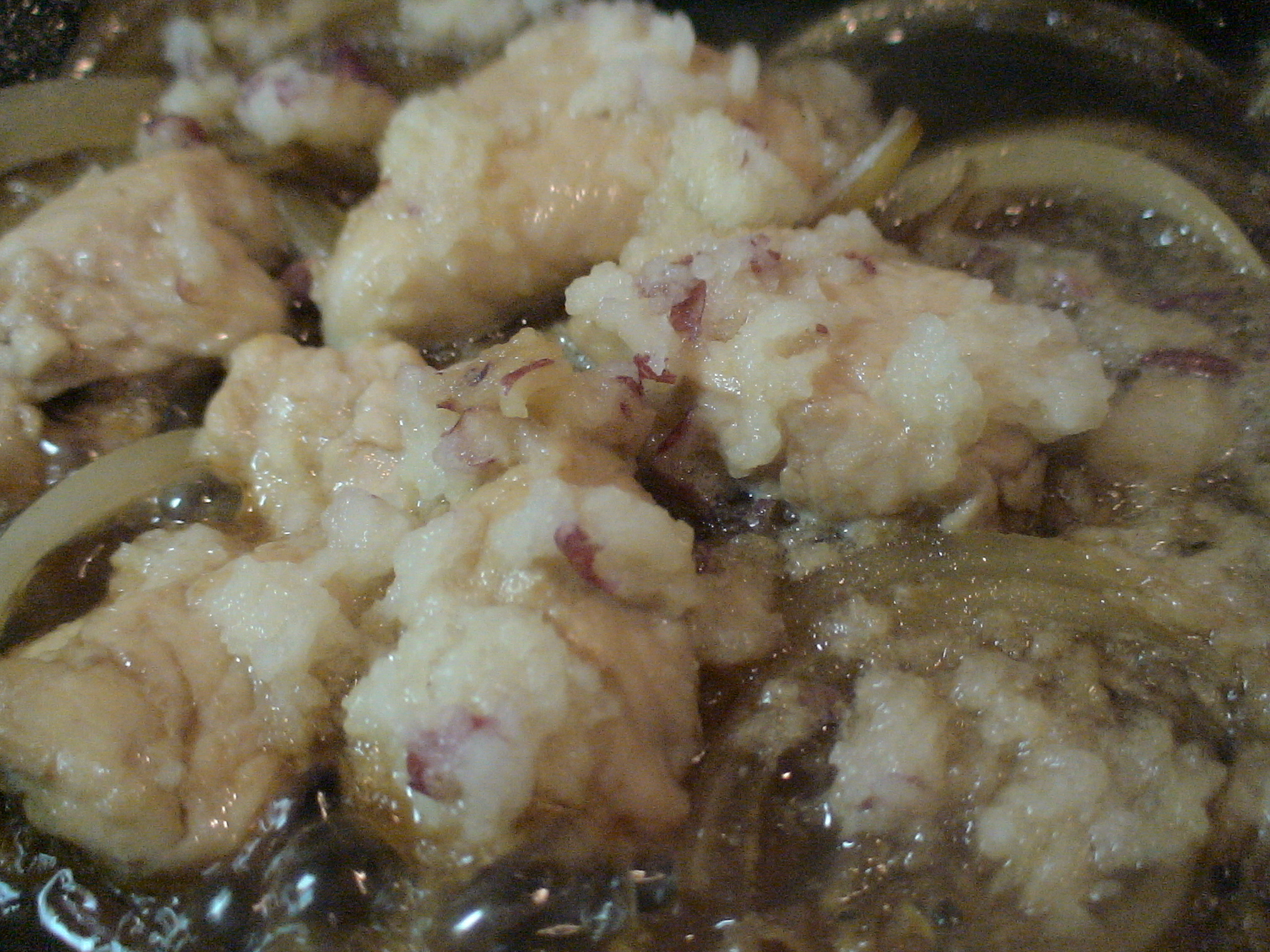 2.鍋に調味料の酒、しょう油を入れ、火をつける前に玉ネギのスライスを入れ、鶏肉をその上におきます。